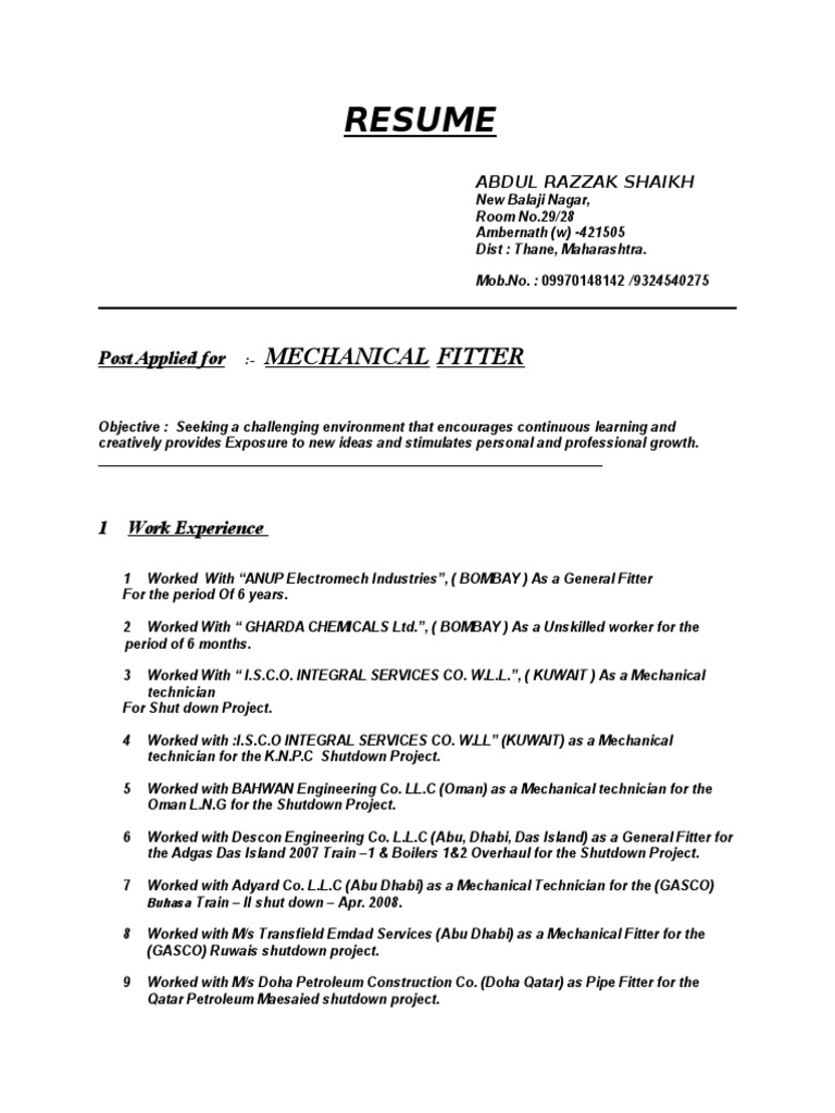 Iti fitter resume format doc beautiful iti fitter resume format.